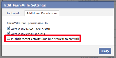 Another helpful thing you can do if you don't want to see your profile Wall cluttered with various game updates, is to prevent games from publishing short stories on your wall. You can do that by choosing "Application Settings" from the "Account" menu (top right). Find your application on the list, click on "Edit Settings" and check the "Additional Permissions" tab in the box that opens.