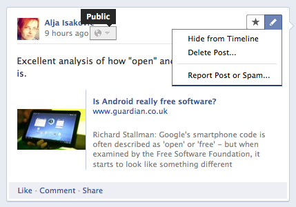 - You're control of what is shown, hidden or featured and who gets to see it. Just hover over any item on your timeline and you have the option to Feature it more prominently, Hide it, so it won't sneak up on you ever again, check and change the visibility of items and everything else that's relevant for an item. It's a mission control center even NASA would be proud to have. And it's not just for geeks like me; it's really easy to use and understand. I think even my cat will use this feature once he figures out how to use my trackpad.